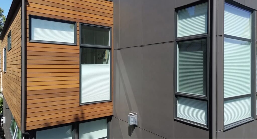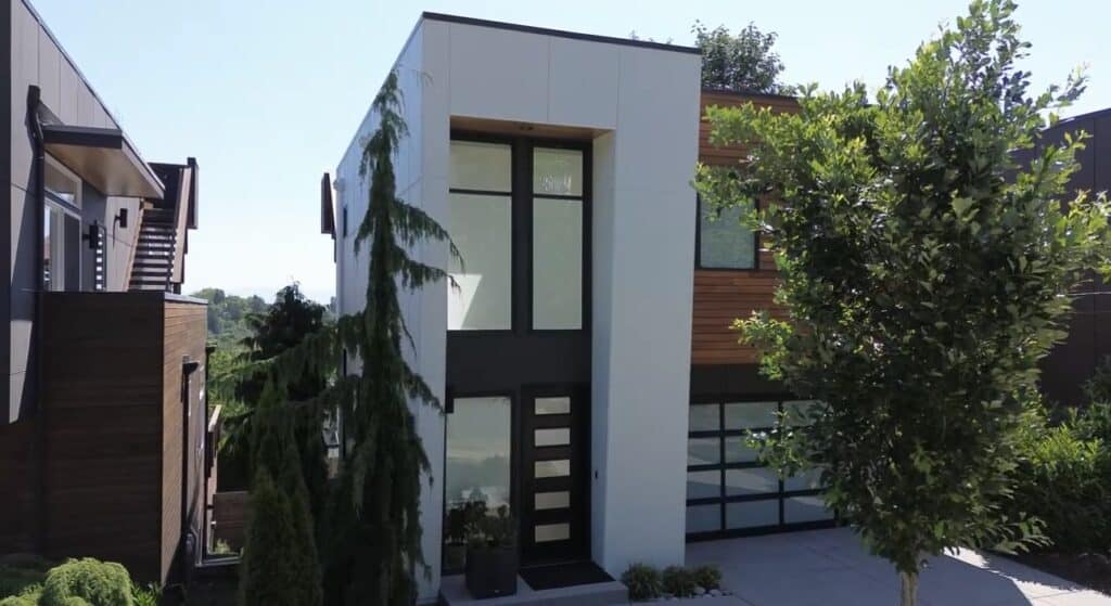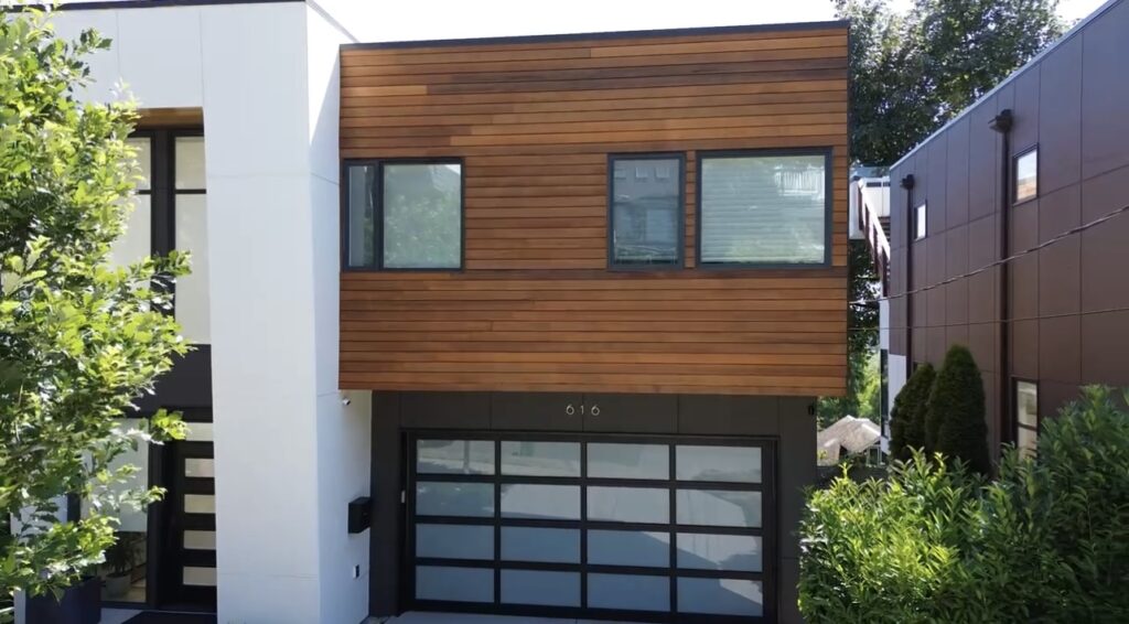 For this home, we painted the siding in a two-tone combination of SW 6385 Dover White and SW 7020 Black Fox for a striking yet balanced look. The wood on the deck, front, side, and back was stained with Sikkens Cedar, maintaining a warm, natural finish. We love the colors that these clients chose and couldn’t think of a more perfect combination to create the modern vibe shown above.